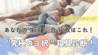 暮らしのコト 雲のやすらぎ三つ折り・敷布団・マットレス比較!あなたに合う寝具選びをサポート 「雲のやすらぎプレミアム」の三つ折り、敷布団、マットレスの3タイプを徹底比較!硬さ、厚さ、手入れのしやすさ、価格の違いを一覧で解説。あなたにぴったりの一枚が見つかる決定版ガイドです。 2025.11.28 暮らしのコト